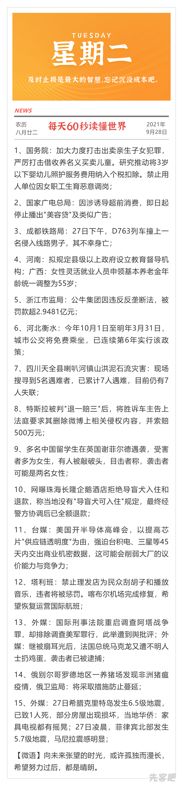 [每天60秒] 【9.28】●每日一早报·简约读新闻● |